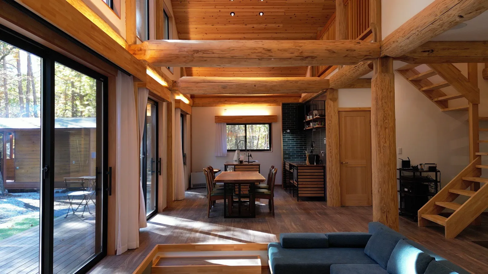 重厚な木組みで建てられた建物はとても広くてゆったり。寝室に出来るお部屋は3部屋有りました。皆んなが座っても寝転んでも大丈夫な大きなソファに本格的な暖炉もあり、次は寒くなる頃に来たいなぁと期待値アップ。雪の頃もステキだろうなぁ。