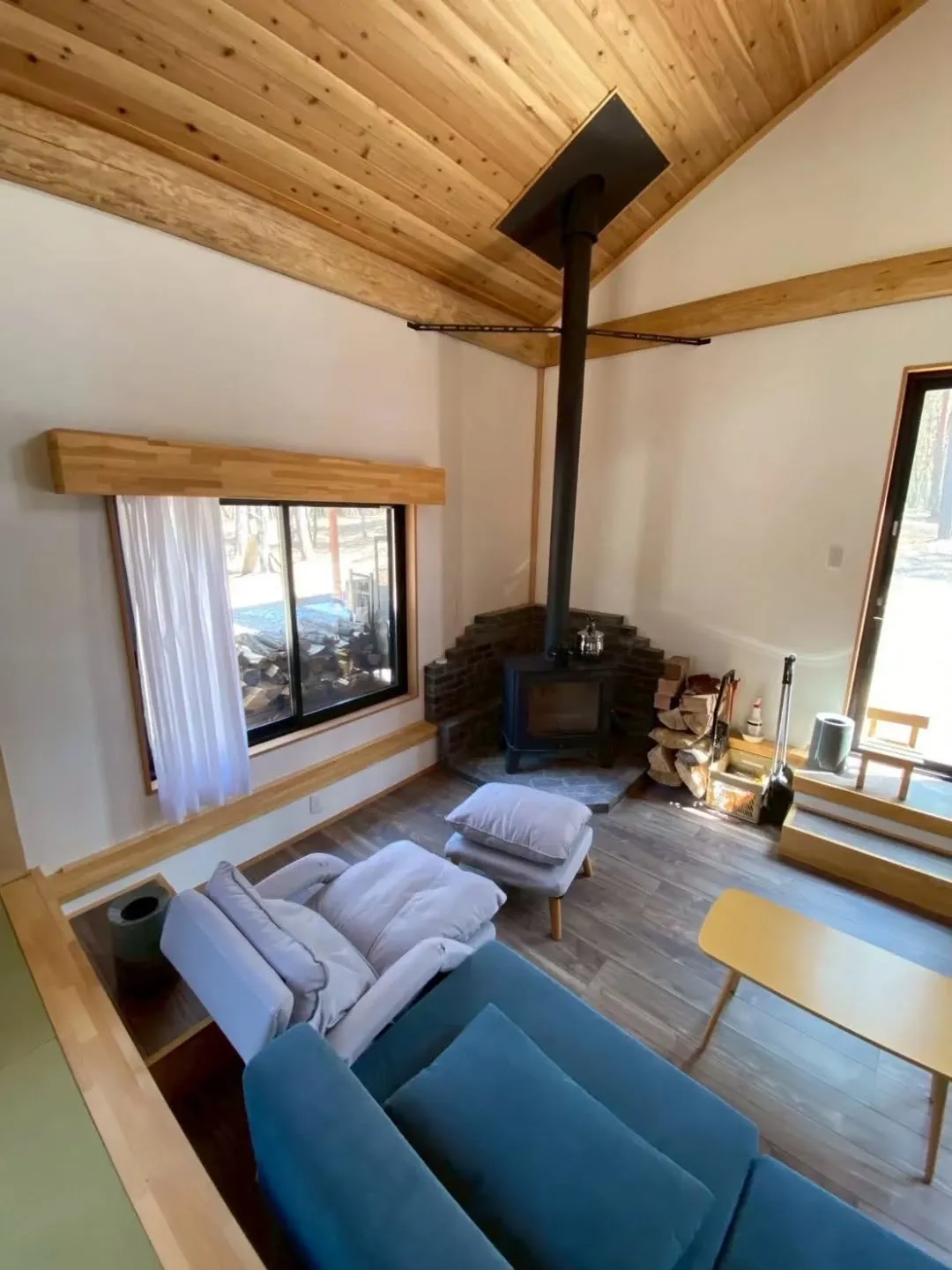森の静けさに包まれたリビングで過ごす時間は、都会の喧騒から離れ心を落ち着かせます。薪ストーブの柔らかな炎が部屋を温め、木の香りがほのかに漂う空間は心をゆっくりとほぐしてくれリラックスさせてくれます。大きな窓から差し込む自然光と、外に広がる森の景色が、室内にいながらも自然とつながっている感覚をもたらします🌲