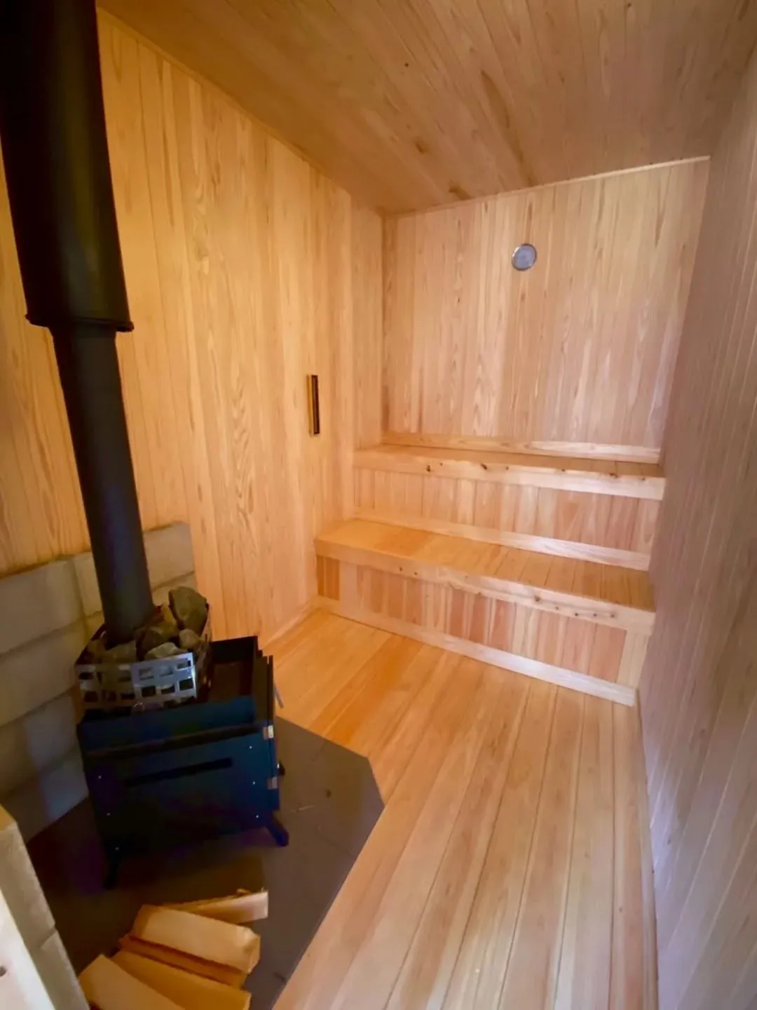 室は、木の香りと静けさが調和した落ち着いた空間です。扉を閉めた瞬間に外の喧騒が遠ざかり、柔らかな灯りと木材の温もりが視界を包み込みます。ベンチに腰を下ろすと、身体の芯からじんわりと温まり、深い呼吸が自然と生まれてくるような感覚があります。薪がはぜる音がわずかに響き、静寂の中に小さなリズムを刻むこの空間は、心を整えるための特別な空間です。🌲